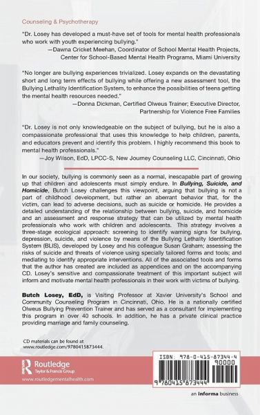 In our society, bullying is commonly seen as a normal, inescapable part of growing up that children and adolescents must simply endure. In Bullying, Suicide, and Homicide, Butch Losey challenges this viewpoint, arguing that bullying is not a part of childhood development, but rather an aberrant behavior that, for the victim, can lead to adverse decisions, such as suicide and homicide. He provides a detailed understanding of the relationship between bullying, suicide, and homicide and an assessment and response strategy that can be utilized by mental health professionals who work with children and adolescents. This strategy involves a three stage ecological approach: screening to identify warning signs for bullying, depression, suicide, and violence by means of the Bullying Lethality Identification System (BLIS), developed by Losey and a colleague; assessing the risks of suicide and threats of violence using specially tailored forms and tools; and mediating to identify appropriate interventions. All of the associated tools and forms that the author has created are included as appendices and on the accompanying CD. Losey's sensitive and compassionate treatment of this important subject will inform and motivate mental health professionals in their work with victims of bullying.The main objective of this book is to provide a detailed understanding of the relationship between bullying, suicide, and homicide and to offer an assessment and response strategy that is useful for mental health professionals who work with children. It will help readers understand that bullying is not a part of childhood development, but rather an aberrant behavior that for the victim can lead to adverse decisions, such as suicide and homicide.