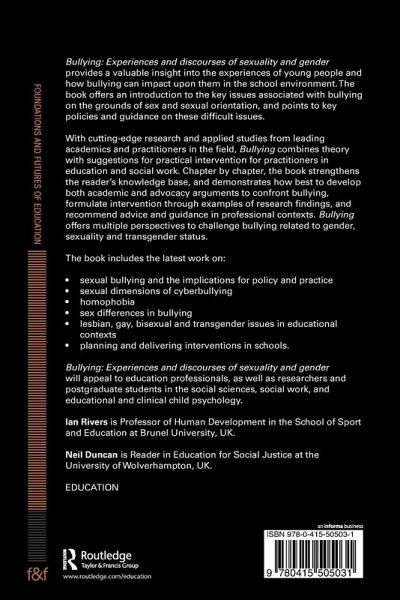 Bullying: Experiences and Discourses of Sexuality and Gender provides a valuable insight into the experiences of young people and how bullying can impact upon them in the school environment. The book offers an introduction to the key issues associated with bullying on the grounds of sex and sexual orientation, and points to key policies and guidance on these difficult issues. With cutting-edge research and applied studies from leading academics and practitioners in the field, Bullying combines theory with suggestions for practical intervention for practitioners in education and social work. Chapter by chapter, the book strengthens the reader's knowledge base, and demonstrates how best to develop both academic and advocacy arguments to confront bullying, formulate intervention through examples of research findings, and recommend advice and guidance in professional contexts. Bullying offers multiple perspectives to challenge bullying related to gender, sexuality, and transgender status. The book includes the latest work on: sexual bullying and the implications for policy and practice sexual dimensions of cyberbullying homophobia sex differences in bullying lesbian, gay, bisexual and transgender issues in educational contexts planning and delivering interventions in schools. Bullying: Experiences and Discourses of Sexuality and Gender will appeal to education professionals, as well as researchers and postgraduate students in the social sciences, social work and educational and clinical child psychology.