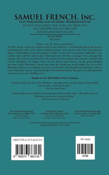 Drama / 3m, 3f / Finalist for the 2007 Pulitzer Prize in Drama In 1955, in the redwood country north of San Francisco, a multiracial girl grows up in a predominantly white town whose residents pepper their speech with the historical dialect of Boontling. Found floating in a basket on the river as an infant, Bulrusher is an orphan with a gift for clairvoyance that makes her feel like a stranger even amongst the strange: the taciturn schoolteacher who adopted her, the madam who runs her brothel w