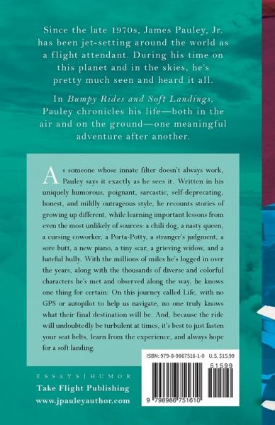 Since the late 1970s, James Pauley, Jr. has been jet-setting around the world as a flight attendant. During his time on this planet and in the skies, he's pretty much seen and heard it all. In Bumpy Rides and Soft Landings, Pauley chronicles his life-both in the air and on the ground-one meaningful adventure after another. As someone whose innate filter doesn't always work, Pauley says it exactly as he sees it. Written in his uniquely humorous, poignant, sarcastic, self-deprecating, honest, and mildly outrageous style, he recounts stories of growing up different, while learning important lessons from even the most unlikely of sources: a chili dog, a nasty queen, a cursing coworker, a Porta-Potty, a stranger's judgment, a sore butt, a new piano, a tiny scar, a grieving widow, and a hateful bully. With the millions of miles he's logged in over the years, along with the thousands of diverse and colorful characters he's met and observed along the way, he knows one thing for certain: On this journey called Life, with no GPS or autopilot to help us navigate, no one truly knows what their final destination will be. And, because the ride will undoubtedly be turbulent at times, it's best to just fasten your seat belts, learn from the experience, and always hope for a soft landing.