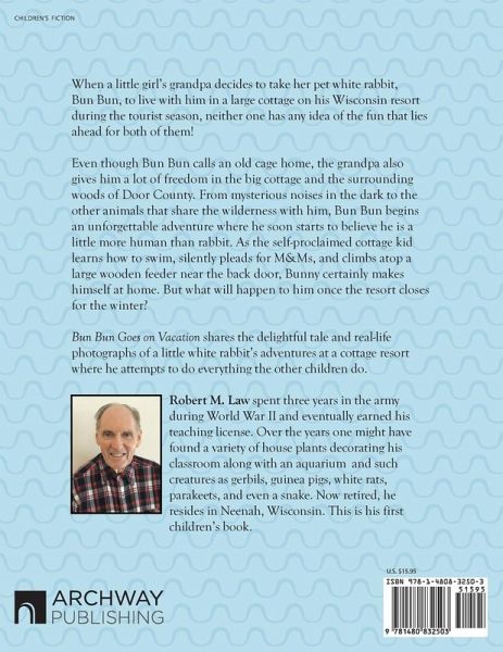 When a little girl's grandpa decides to take her pet white rabbit, Bun Bun, to live with him in a large cottage on his Wisconsin resort during the tourist season, neither one has any idea of the fun that lies ahead for both of them! Even though Bun Bun calls an old cage home, the grandpa also gives him a lot of freedom in the big cottage and the surrounding woods of Door County. From mysterious noises in the dark to the other animals that share the wilderness with him, Bun Bun begins an unforgettable adventure where he soon starts to believe he is a little more human than rabbit. As the self-proclaimed cottage kid learns how to swim, silently pleads for M&Ms, and climbs atop a large wooden feeder near the back door, Bunny certainly makes himself at home. But what will happen to him once the resort closes for the winter? Bun Bun Goes on Vacation shares the delightful tale and real-life photographs of a little white rabbit's adventures at a cottage resort where he attempts to do everything the other children do.