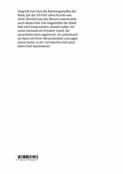 Gegrüßt hat mich die Bankangestellte derBank, bei der ich fünf Jahre Kunde war,nicht. Ähnlich war der Besuch meinerseitsauch dieses Mal. Die Angestellte der Bankließ mich ewig warten, obwohl außer mirsonst niemand am Schalter stand. Sieverachtete mich regelrecht. Ich unterbrachsie dann mit ihrer Versunkenheit und sagteetwas lauter zu ihr: Ich möchte mich jetztbeim Chef beschweren.