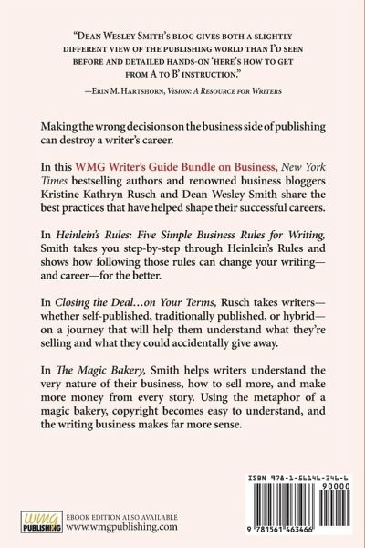 Making the wrong decisions on the business side of publishing can destroy a writer's career. In this WMG Writer's Guide Bundle on Business, New York Times bestselling authors and renowned business bloggers Kristine Kathryn Rusch and Dean Wesley Smith share the best practices that have helped shape their successful careers. In Heinlein's Rules: Five Simple Business Rules for Writing, Smith takes you step-by-step through Heinlein's Rules and shows how following those rules can change your writing-and career-for the better. In Closing the Deal...on Your Terms, Rusch takes writers-whether self-published, traditionally published, or hybrid-on a journey that will help them understand what they're selling and what they could accidentally give away. In The Magic Bakery, Smith helps writers understand the very nature of their business, how to sell more, and make more money from every story. Using the metaphor of a magic bakery, copyright becomes easy to understand, and the writing business makes far more sense.