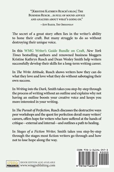 The secret of a great story often lies in the writer's ability to hone their craft. But many struggle to do so without destroying their unique voice. In this WMG Writer's Guide Bundle on Craft, New York Times bestselling authors and renowned business bloggers Kristine Kathryn Rusch and Dean Wesley Smith help writers successfully develop their skills for a long-term writing career. In The Write Attitude, Rusch shows writers how they can do what they love and love what they do without sabotaging their own success. In Writing into the Dark, Smith takes you step-by-step through the process of writing without an outline and explains why not having an outline boosts your creative voice and keeps you more interested in your writing. In The Pursuit of Perfection, Rusch discusses the destructive ways peer workshops and the quest for perfection derail many writers' careers, offers hope for writers who have suffered at the hands of critique-external and internal-and outlines a path to healing. In Stages of a Fiction Writer, Smith takes you step-by-step through the stages most fiction writers go through and how not to lose hope along the way.