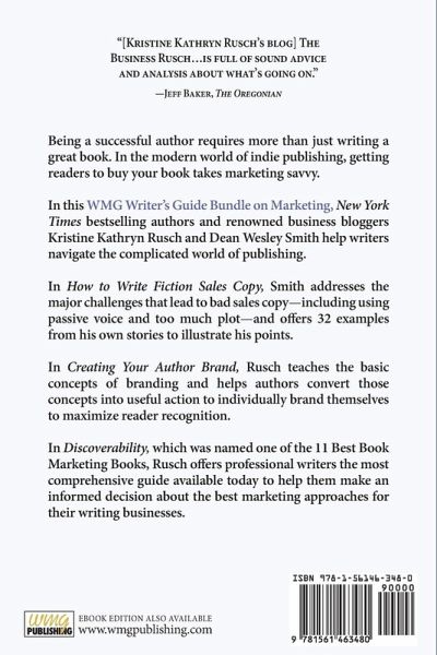 Being a successful author requires more than just writing a great book. In the modern world of indie publishing, getting readers to buy your book takes marketing savvy. In this WMG Writer's Guide Bundle on Marketing, New York Times bestselling authors and renowned business bloggers Kristine Kathryn Rusch and Dean Wesley Smith help writers navigate the complicated world of publishing. In How to Write Fiction Sales Copy, Smith addresses the major challenges that lead to bad sales copy-including using passive voice and too much plot-and offers 32 examples from his own stories to illustrate his points. In Creating Your Author Brand, Rusch teaches the basic concepts of branding and helps authors convert those concepts into useful action to individually brand themselves to maximize reader recognition. In Discoverability, which was named one of the 11 Best Book Marketing Books, Rusch offers professional writers the most comprehensive guide available today to help them make an informed decision about the best marketing approaches for their writing businesses.