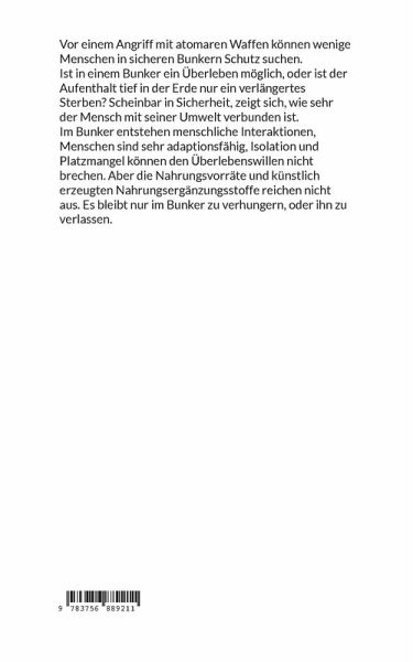 Vor einem Angriff mit atomaren Waffen können wenige Menschen in sicheren Bunkern Schutz suchen. Ist in einem Bunker ein Überleben möglich, oder ist der Aufenthalt tief in der Erde nur ein verlängertes Sterben? Scheinbar in Sicherheit, zeigt sich, wie sehr der Mensch mit seiner Umwelt verbunden ist.Im Bunker entstehen menschliche Interaktionen, Menschen sind sehr adaptionsfähig, Isolation und Platzmangel können den Überlebenswillen nicht brechen. Aber die Nahrungsvorräte und künstlich erzeugten Nahrungsergänzungsstoffe reichen nicht aus. Es bleibt nur im Bunker zu verhungern, oder ihn zu verlassen.