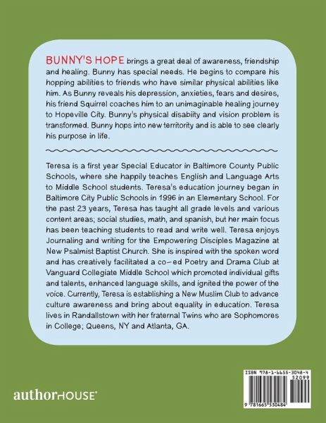 Bunny's Hope brings a great deal of awareness, friendship and healing. Bunny has special needs. He begins to compare his hopping abilities to friends who have similar physical abilities like him. As Bunny reveals his depression, anxieties, fears and desires, his friend Squirrel coaches him to an unimaginable healing journey to Hopeville City. Bunny's physical disabiity and vision problem is transformed. Bunny hops into new territority and is able to see clearly his purpose in life.