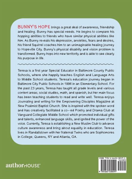 Bunny's Hope brings a great deal of awareness, friendship and healing. Bunny has special needs. He begins to compare his hopping abilities to friends who have similar physical abilities like him. As Bunny reveals his depression, anxieties, fears and desires, his friend Squirrel coaches him to an unimaginable healing journey to Hopeville City. Bunny's physical disabiity and vision problem is transformed. Bunny hops into new territority and is able to see clearly his purpose in life.