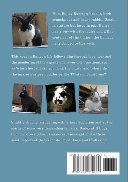 Meet Bailey Bunster; honker, herb connoisseur and house rabbit. Small in stature but large in ego, Bailey has a way with the ladies and a fine contempt of the 'oldies', the humans he is obliged to live with. This year in Bailey's life follows him through love, loss and the pondering of life's great unanswerable questions; such as 'which herbs make you honk the most?' and 'where do the mysterious pee puddles by the TV stand come from?' Slightly chubby, struggling with a herb addiction and at the mercy of some very demanding females, Bailey still finds humour at every turn and never loses sight of the three most important things in life: Food, Love and Chillaxing.