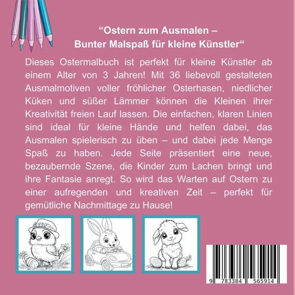 Oster-Malspaß für kleine Künstler ab 3 Jahren! Dieses liebevoll gestaltete Ostermalbuch begeistert kleine Künstler mit 36 wunderschönen Ausmalmotiven rund um das Osterfest! Fröhliche Osterhasen, niedliche Küken, kuschelige Lämmer, bunte Ostereier und zauberhafte Frühlingsszenen laden Kinder dazu ein, ihrer Kreativität freien Lauf zu lassen.Dank der klaren, kindgerechten Linien ist dieses Malbuch ideal für kleine Hände und perfekt geeignet, um spielerisch das Ausmalen zu üben. Ob zu Hause, im Kindergarten oder als Geschenk im Osternest - dieses Buch sorgt für stundenlangen Malspaß und macht das Warten auf Ostern noch schöner! Highlights: 36 liebevolle Ostermotive für Mädchen & Jungen Einfache, klare Linien - perfekt für kleine Hände Fördert die Kreativität und Feinmotorik Mit Osterhasen, Küken, Lämmern & Frühlingslandschaften Ideal als Ostergeschenk oder für gemütliche Malnachmittage Format (21 x 21 cm) für extra viel Malspaß Ideal für Buntstifte und Wachsmalkreiden Papierstärke von 90 g/m²Lass dein Kind in die fröhliche Osterwelt eintauchen und den Osterzauber auf jeder Seite entdecken!