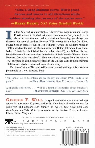 In this New York Times bestseller, Pulitzer Prize-winning author George F. Will returns to baseball with more than seventy finely honed pieces about the sometimes recondite, sometimes frustrating, yet always passionately felt national pastime. Here are Will's eulogy for the late Curt Flood ("Dred Scott in Spikes"), Will on Ted Williams ("When Ted Williams retired in 1960, a sportswriter said that Boston knew how Britain felt when it lost India. Indeed, Britain felt diminished, but also a bit relieved"), and Will on his own baseball career ("I was a very late draft choice of the Mittendorf Funeral Home Panthers. Our color was black"). Here are subjects ranging from the author's 1977 purchase of a single share of stock in the Chicago Cubs to the memorable 1998 season, which is discussed in an all-new essay. For fans of Men at Work and Will's other baseball writings, this book is as pleasurable as a well-executed bunt.