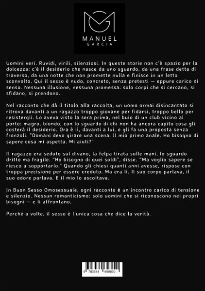 Uomini veri. Ruvidi, virili, silenziosi. In queste storie non c'è spazio per la dolcezza: c'è il desiderio che nasce da uno sguardo, da una frase detta di traverso, da una notte che non promette nulla e finisce in un letto sconvolto. Qui il sesso è nudo, concreto, senza pretesti - eppure carico di senso. Nessuna illusione, nessuna promessa: solo corpi che si cercano, si sfidano, si prendono.Nel racconto che dà il titolo alla raccolta, un uomo ormai disincantato si ritrova davanti a un ragazzo troppo giovane per fidarsi, troppo bello per resistergli. Lo aveva visto la sera prima, nel buio di un club vicino al porto: magro, biondo, con lo sguardo di chi non ha ancora capito cosa gli costerà il desiderio. Ora è lì, davanti a lui, e gli fa una proposta senza fronzoli: "Domani devo girare una scena. Il mio primo anale. Ho bisogno di sapere cosa mi aspetta. Mi aiuti?"Il ragazzo era seduto sul divano, la felpa tirata sulle mani, lo sguardo dritto ma fragile. "Ho bisogno di quei soldi", disse. "Ma voglio sapere se riesco a sopportarlo." Quando gli chiesi quanti anni avesse, rispose con troppa precisione per essere creduto. Ma era lì. Il suo corpo parlava, il suo odore parlava. E il mio lo ascoltava.In Buon Sesso Omosessuale, ogni racconto è un incontro carico di tensione e silenzio. Nessun romanticismo: solo uomini che si riconoscono nei propri bisogni - e li affrontano.Perché a volte, il sesso è l'unica cosa che dice la verità.