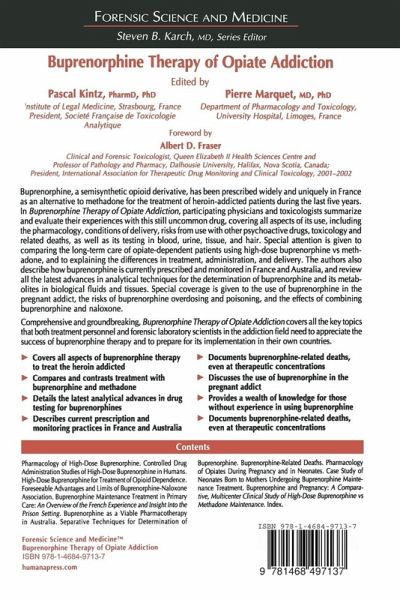 "This is a very useful and timely book in addiction medicine. . .This book details the use of buprenorphine with its risks and benefits. It draws extensively from available studies and literature, which are listed very clearly in tables. Some of the appendixes are especially useful for quick references. This is a very useful and easy to read book. It details the use of buprenorphine therapy as an alternate to methadone treatment. It also details the analytical advances in testing for buprenorphines. The book describes buprenorphine's pharmacology and current prescription practices in France. It also discusses the use of buprenorphine in various scenarios including in pregnant addicts, and provides a source of knowledge for everyone working in addiction medicine."-Doody's Health Sciences Book Review Journal