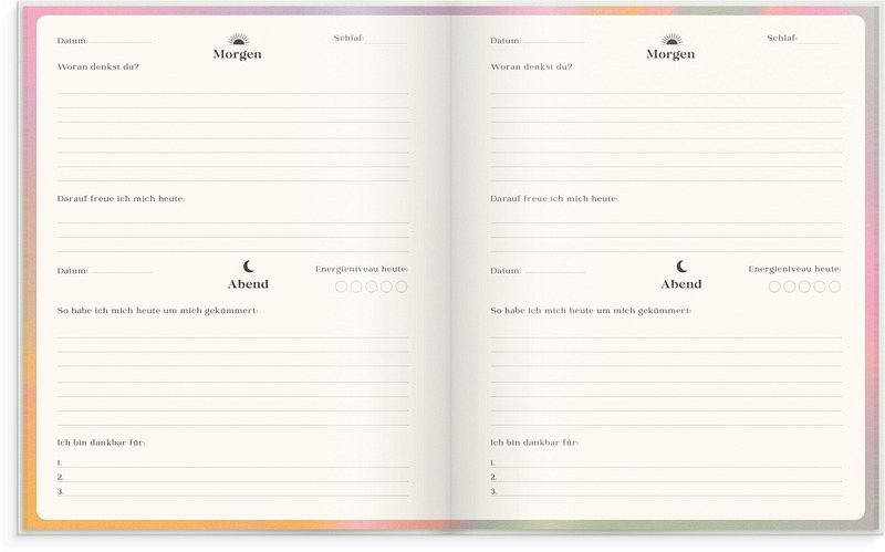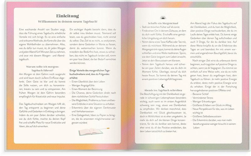Immer mehr Studien zeigen die großen Vorteile des Tagebuchschreibens auf. Es ist eine einfache und kraftvolle Methode, um dein Wohlbefinden zu verbessern. Alles, was du tun musst, ist, jeden Morgen und Abend fünf Minuten deiner Zeit zusammen mit diesem Tagebuch zu investieren. Das Tagebuchschreiben ist besonders kraftvoll am Morgen, wenn das Gehirn ausgeruht ist und eine klare mentale Verfassung hat. Du beginnst den Tag auf sanfte Weise und tauchst in deine Gefühle und Gedanken für den bevorstehenden Tag ein. Indem du ein paar Zeilen über deine Gefühle aufschreibst, kannst du deine Gedanken ordnen und Platz für neue Eindrücke und Ideen schaffen. Am Abend liegt der Fokus des Tagebuchs auf Dankbarkeit, und du hast die Möglichkeit, über die positiven Dinge nachzudenken, die an deinem Tag passiert sind. So beendest du den Tag mit einem angenehmen Gefühl im Körper, bevor du einschläfst. Abmessung: 175 x 214 x 25 mm. Einband: Linierter Karton. Eingefasst. Einzelheiten: Elastisch. Bandmarker. Seitenzahl: 224. Papiergewicht: 115 g. Umweltinformationen: FSC®. Marke: Burde.