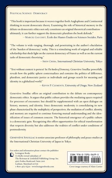 In The Burden of Democracy: The Claims of Cultures and Public Culture, Geneviève Souillac offers an original contribution to the debate on contemporary democratic ethics and vindicates the universal development of democracy. This book argues that a public culture articulated around the three principles of deliberative justice, history and encounter can deepen inclusion, mediation, and democratic pluralism under conditions of postmodernity.