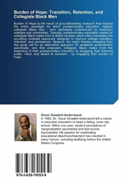 Burden of Hope is the result of groundbreaking research that impacts the entire paradigm by which postsecondary education regards collegiate Black men - men repeatedly underserved by America s colleges and universities. Typically, postsecondary education relates to collegiate Black males from a deficit mindset, which often translates into providing remedial resources designed to improve college transition, retention, and persistence. However, the major themes emerging from this study call for an alternative approach for academic achievement, specifically, one that empowers collegiate Black males from the beginning of their postsecondary transition by engaging their inherent power, need, and desire to succeed by engaging their burden of hope.