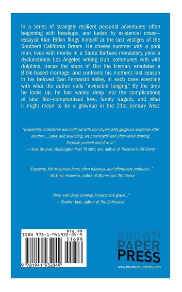 In a series of strangely resilient personal adventures-often beginning with breakups, and fueled by a sense of "invincible longing"-essayist Alan Rifkin flings himself at the last vestiges of the Southern California Dream. He chases summer with a pool man, lives with monks in a Santa Barbara monastery, joins a dysfunctional Los Angeles writing club, communes with wild dolphins, traces the steps of Otzi the Iceman, emulates a Bible-based marriage, and confronts his mother's last season in his beloved San Fernando Valley, in each case wrestling with mysteries of heaven and earth. By the time he looks up, he has waded deep into the complications of later life-compromised love, family tragedy, and what it might mean to be a grownup in the 21st century West.