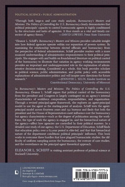In Bureaucracy's Masters and Minions the author argues that political control of the bureaucracy from the president and the Congress is largely contingent on an agency's internal characteristics of workforce composition, workforce responsibilities, and workforce organization.