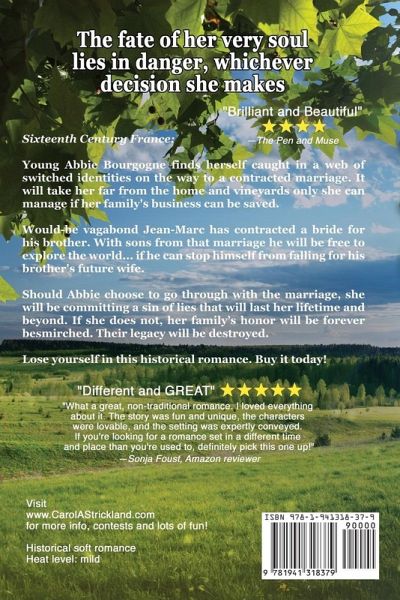 Torn from her land by a false betrothal! The fate of her very soul lies in danger, whichever decision she makes Sixteenth Century France: Young Abbie Bourgogne finds herself caught in a web of switched identities on the way to a contracted marriage. It will take her far from the home and vineyards only she can manage if her family's business can be saved. Would-be vagabond Jean-Marc has contracted a bride for his brother. With sons from that marriage he will be free to explore the world... if he can stop himself from falling for his brother's future wife. Should Abbie choose to go through with the marriage, she will be committing a sin of lies that will last her lifetime and beyond. If she does not, her family's honor will be forever besmirched. Their legacy will be destroyed. Lose yourself in this sweet historical romance. Buy it today!
