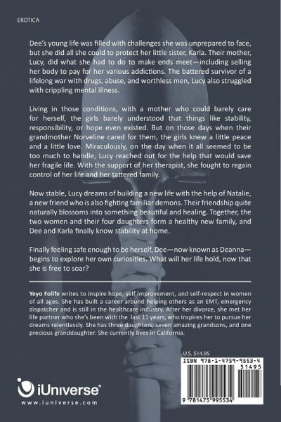 Dee's young life was filled with challenges she was unprepared to face, but she did all she could to protect her little sister, Karla. Their mother, Lucy, did what she had to do to make ends meet-including selling her body to pay for her various addictions. The battered survivor of a lifelong war with drugs, abuse, and worthless men, Lucy also struggled with crippling mental illness. Living in those conditions, with a mother who could barely care for herself, the girls barely understood that things like stability, responsibility, or hope even existed. But on those days when their grandmother Norveline cared for them, the girls knew a little peace and a little love. Miraculously, on the day when it all seemed to be too much to handle, Lucy reached out for the help that would save her fragile life. With the support of her therapist, she fought to regain control of her life and her tattered family. Now stable, Lucy dreams of building a new life with the help of Natalie, a new friend who is also fighting familiar demons. Their friendship quite naturally blossoms into something beautiful and healing. Together, the two women and their four daughters form a healthy new family, and Dee and Karla finally know stability at home. Finally feeling safe enough to be herself, Dee-now known as Deanna-begins to explore her own curiositi es. What will her life hold, now that she is free to soar?