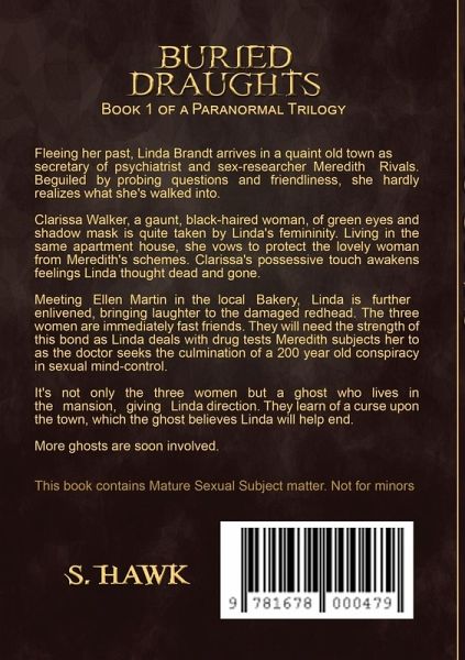 Fleeing her past for a new town, Linda Brandt accepts a secretary's position from psychiatrist and sex researcher, Dr. Meredith Rivals, and unknowingly becomes a guinea pig in a two hundred year old experiment in mind control, the catalyst behind Clarissa Walker's revenge and the hope of the ghost, Liz, to end this curse. Buried Draughts is book one of an adult paranormal fiction trilogy. For over two centuries the families running the town did so with a plan. Seeking a position among them, Meredith works at perfecting a chemical means of sexually controlling people, using Linda as an experimental case study. Clarissa is marked by the whip and a cloak of insanity, due to her brother, Anton, and Meredith's early experiments, Clarissa sees Linda's danger and beauty. Linda, thinking herself an empty shell of the woman she once was, responds to Clarissa's flirtation and painful possession... finding renewal. Ignoring ghostly warnings, Linda stays, submitting to Clarissa's plan. Ellen Martin had been drugged, raped, and dropped onto the spikes of Hell's Gate of the cemetery, as a sacrificial lamb, to seal that passage. Surviving, less one eye and half a breast, she works in her father's bakery, refusing to live... until connecting with Linda. As the three women grow close, Liz has them rescue spirits trapped by those ruling families, hoping to break the curse that holds them. While Meredith tests her drugs on Linda and another victim, Clarissa, Ellen and the ghosts work to strengthen Linda. For Clarissa's plan to succeed, they need Meredith's advancement and connections, leaving Linda in her dangerous control. At Anton's return, working for the ranked families, Clarissa draws the line, intending to kill her brother and his group, to claim what he came to rescue from an abandoned and destroyed mansion.