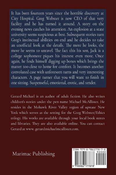 Book 2 of the Greg Webster/ Ethics Series. It has been fourteen years since the horrible discovery at City Hospital. A story on the evening new catches Greg's attention. An explosion at a state university seems suspicious at best. Subsequent stories turn Greg's instinctual abilities on end, and he decides to take an unofficial look at the details. The more he looks, the more things seem to unravel. The fact that his son, Jack is a college sophomore piques his interest even more. Once again, Greg finds himself digging up bones which brings the matter too close to home for comfort. It becomes a convoluted case with unforeseen turns and very interesting characters. A page turner that you will want to finish in one sitting. Suspenseful, emotional, erotic and tender.
