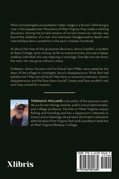 When archaeologists excavated an Indian village in a farmer's field along a river in the Appalachian Mountains of West Virginia, they made a startling discovery. Among the buried remains of ancient American natives, was found the skeleton of a man who had been bludgeoned to death and interred face down sometime in the early nineteen-hundreds. At about the time of this gruesome discovery, Jenny Franklin, a student at State College, went missing. As far as everyone knew, she was a happy, studious individual who was majoring in sociology. One day she was there, the next, she was gone without a trace. Professor Jimmy Houston and his friend, Sam Miller, were asked by the dean of the college to investigate Jenny's disappearance. What fate had befallen her? Was she still alive? Was there a connection between Jenny's disappearance and the face down burial? Jimmy and Sam wouldn't rest until they solved this mystery.