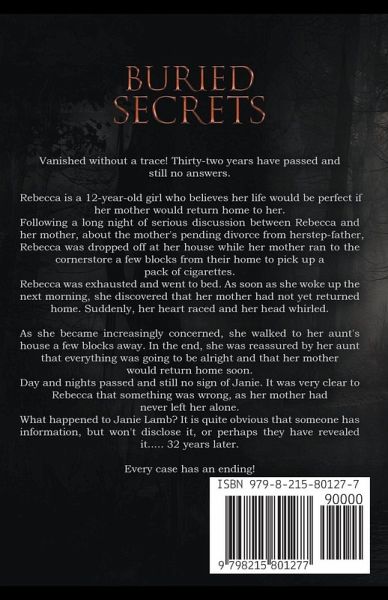 Vanished without a trace! Rebecca is a 12-year-old girl who believes her life would be perfect if her mother would return home. Following a long night of serious discussion about the mother's pending divorce from her step-father, Rebecca was dropped off at home. While her mother ran to the store, a few blocks away to pick up a pack of cigarettes. Rebecca was exhausted and went to bed. As soon as she awoke the next morning, she discovered that her mother had not returned. Suddenly, her heart raced and her head whirled. Days passed and still no sign of Janie. Something was wrong. Her mother had never left her alone. What happened to Janie Lamb? Someone had information, but wouldn't disclose it, or perhaps they did..... 32 years later. Every case has an ending!
