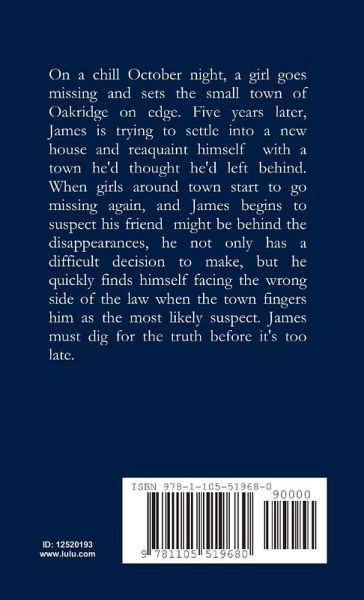 On a chill October night, a girl goes missing and sets the small town of Oakridge on edge. Five years later, James is trying to settle himself in a new house and reacquaint himself with a town he'd thought he'd left behind. When girls around town start to go missing again and James begins to suspect his friend might be behind the disappearances, he not only has a difficult decision to make, but he quickly finds himself facing the wrong side of the law as the town fingers him as the most likely suspect. James must dig for the truth before it's too late.