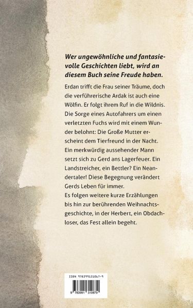 Wer ungewöhnliche und fantasievolle Geschichten liebt, wird an diesem Buch seine Freude haben.Erdan trifft die Frau seiner Träume, doch die verführerische Ardak ist auch eine Wölfin. Er folgt ihrem Ruf in die Wildnis.Die Sorge eines Autofahrers um einen verletzten Fuchs wird mit einem Wunder belohnt: Die Große Mutter erscheint dem Tierfreund in der Nacht.Ein merkwürdig aussehender Mann setzt sich zu Gerd ans Lagerfeuer. Ein Landstreicher, ein Bettler? Ein Neandertaler! Diese Begegnung verändert Gerds Leben für immer.Es folgen weitere kurze Erzählungen bis hin zur berührenden Weihnachtsgeschichte, in der Herbert, ein Obdachloser, das Fest allein begeht.