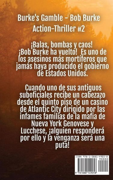 Balas, bombas y Caos! Bob Burke está de vuelta! Es el Francotirador Americano conoce al Padrino, Ronda #2, o Bob Lee Swagger se enfrenta a la mafia de la ciudad de Nueva York. 4.5 estrellas en 879 US Amazon valoraciones.Excelente nueva traducción! 5-21-23. De modales suaves y de constitución ligera, este ejecutivo de una compañía de telecomunicaciones es fácilmente descartado como el "tipo del teléfono". "Después de cuatro giras dirigiendo misiones de 'operaciones especiales' en Irak y las escarpadas montañas de Afganistán como Guardabosques del Ejército y comandante de la Fuerza Delta, es uno de los asesinos más letales que el gobierno de Estados Unidos haya producido. Cuando uno de sus antiguos suboficiales recibe un cabezazo desde el quinto piso de un casino de Atlantic City dirigido por las infames familias de la mafia Genovese y Lucchese NY, alguien va a responder por ello y la venganza va a ser una perra. Esta vez, no será una cacería de 'Gumbah' con rifles de francotirador en un parque de la reserva Forestal de Chicago. Bob y sus Alegres Hombres van a tomar el dinero de la Mafia, todo, de un Don de la Mafia escondido en el ático del casino, respaldado por una docena de pistoleros de la mafia y un equipo de élite de mercenarios extranjeros. Mientras que siempre hay un lugar para un Barrett .Con un rifle de francotirador calibre 50 o dos, esta vez Bob llama a un par de frikis informáticos con cara de bebé, un general del Ejército de dos estrellas, un detective de homicidios de Chicago, una piloto de la Fuerza Aérea, un programador de computadoras ruso, uno de los carteristas más famosos del mundo y su nueva esposa, Linda. Desde helicópteros furtivos hasta yates de lujo, arrastreros de pesca y carrocerías en bidones de aceite de 55 galones, la acción no se detiene. En busca de un buen libro de playa o algo con lo que acurrucarse frente al fuego, este thriller de conspiración de rápido movimiento es del autor de Burke's War, Burke's Gamble, Burke's Revenge, Burke's Samovar, the new Burke's Mandarin y el próximo Burke's Rescue, además de The Undertaker, Amongst My Enemies, Thursday at Noon, Winner Lose All y Aim True, My Brothers y la serie Our Vietnam Wars, Volúmenes 1-4, con entrevistas y fotos de 240 veteranos estadounidenses y aliados. Juntos, estos libros tienen más de 1,000 reseñas de 5 estrellas. ¡Que lo disfrutes!
