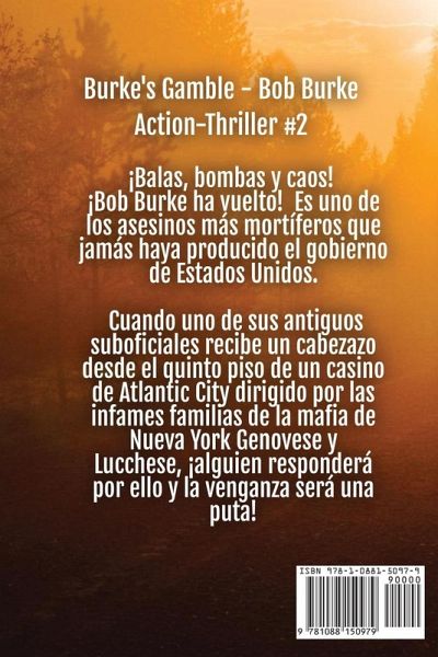 Balas, bombas y Caos! Bob Burke está de vuelta! Es el Francotirador Americano conoce al Padrino, Ronda #2, o Bob Lee Swagger se enfrenta a la mafia de la ciudad de Nueva York. 4.5 estrellas en 879 US Amazon valoraciones.Excelente nueva traducción! 5-21-23. De modales suaves y de constitución ligera, este ejecutivo de una compañía de telecomunicaciones es fácilmente descartado como el "tipo del teléfono". "Después de cuatro giras dirigiendo misiones de 'operaciones especiales' en Irak y las escarpadas montañas de Afganistán como Guardabosques del Ejército y comandante de la Fuerza Delta, es uno de los asesinos más letales que el gobierno de Estados Unidos haya producido. Cuando uno de sus antiguos suboficiales recibe un cabezazo desde el quinto piso de un casino de Atlantic City dirigido por las infames familias de la mafia Genovese y Lucchese NY, alguien va a responder por ello y la venganza va a ser una perra. Esta vez, no será una cacería de 'Gumbah' con rifles de francotirador en un parque de la reserva Forestal de Chicago. Bob y sus Alegres Hombres van a tomar el dinero de la Mafia, todo, de un Don de la Mafia escondido en el ático del casino, respaldado por una docena de pistoleros de la mafia y un equipo de élite de mercenarios extranjeros. Mientras que siempre hay un lugar para un Barrett .Con un rifle de francotirador calibre 50 o dos, esta vez Bob llama a un par de frikis informáticos con cara de bebé, un general del Ejército de dos estrellas, un detective de homicidios de Chicago, una piloto de la Fuerza Aérea, un programador de computadoras ruso, uno de los carteristas más famosos del mundo y su nueva esposa, Linda. Desde helicópteros furtivos hasta yates de lujo, arrastreros de pesca y carrocerías en bidones de aceite de 55 galones, la acción no se detiene. En busca de un buen libro de playa o algo con lo que acurrucarse frente al fuego, este thriller de conspiración de rápido movimiento es del autor de Burke's War, Burke's Gamble, Burke's Revenge, Burke's Samovar, the new Burke's Mandarin y el próximo Burke's Rescue, además de The Undertaker, Amongst My Enemies, Thursday at Noon, Winner Lose All y Aim True, My Brothers y la serie Our Vietnam Wars, Volúmenes 1-4, con entrevistas y fotos de 240 veteranos estadounidenses y aliados. Juntos, estos libros tienen más de 1,000 reseñas de 5 estrellas. ¡Que lo disfrutes!