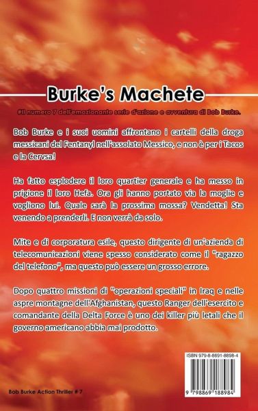 BURKE'S MACHETE: Proiettili, bombe, caos, e tanto divertimento! Il nuovo thriller d'azione di Bob Burke #7 È. 4,5 stelle su 189 recensioni US Amazon! Grande lettura!Bob Burke e i suoi uomini affrontano i cartelli della droga messicani del Fentanyl nel soleggiato Messico, e non è per i Tacos e la Cerveza!Ha fatto esplodere il loro quartier generale e ha messo in prigione il loro Hefe. Ora gli hanno portato via la moglie e vogliono lui. Cosa succederà ora? Vendetta! Sta venendo a prenderli. E non verrà da solo. Mite e di corporatura esile, questo dirigente di una società di telecomunicazioni è spesso considerato il "ragazzo del telefono", ma questo può essere un grosso errore. Dopo quattro missioni di "operazioni speciali" in Iraq e sulle aspre montagne dell'Afghanistan, questo Ranger dell'esercito e comandante della Delta Force è uno degli assassini più letali che il governo americano abbia mai prodotto.Se siete alla ricerca di un buon libro da spiaggia o di qualcosa con cui accoccolarvi davanti al fuoco, questo thriller cospirativo dal ritmo incalzante è stato scritto dall'autore di Burke's War, Burke's Gamble, Burke's Revenge, Burke's Samovar, Burke's Mandarin, Burke's Rescue e il nuovo Burke's Machete. Potrebbero piacervi anche The Undertaker, Amongst My Enemies, Thursday at Noon, Winner Lose All e Aim True, My Brother. Insieme, questi libri hanno oltre 2.00 recensioni a 5 stelle su US Kindle. Buon divertimento!