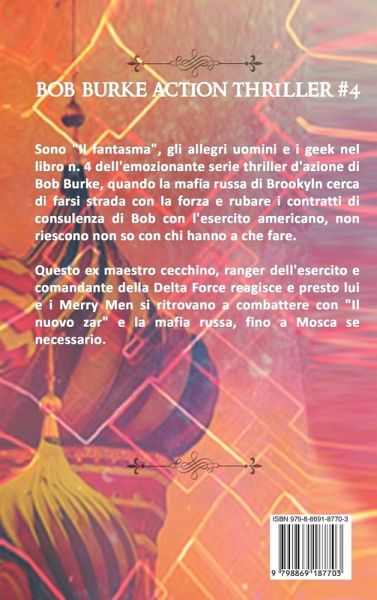 Proiettili, bombe e caos! Bob Burke è tornato per il numero 4! Questa volta si scontra con la mafia russa e con lo "Zar" in persona al Cremlino! 4,6 stelle su 625 recensioni US Amazon! Grande lettura!Quando la mafia russa di Brighton Beach ruba il contratto per il software dell'esercito della sua azienda, fa esplodere l'edificio dei suoi uffici a Chicago e attacca la foresta di Sherwood, è troppo!Dopo gli scontri con i terroristi dell'ISIS, le famiglie mafiose Genovese e Lucchese di New York in un casinò di Atlantic City e una sparatoria con la mafia DiGrigoria di Chicago in un bosco della Forest Preserve, tutto ciò che questo ex cecchino dell'esercito, Ranger e comandante della Delta Force desiderava era tornare alla sua fattoria in North Carolina, rilassarsi e godersi la vita. Ma questo può aspettare. È tempo di smantellare la loro operazione a Brooklyn, di prendere i loro "soldi per il pranzo", di spaccare qualche culo e di fare una visita a domicilio al loro capo nella sua Dacha a Mosca.Con l'aiuto dei Merry Men, di un colonnello dell'esercito russo, di Sasha il russo pazzo, di fucili da cecchino, naturalmente, e di un sacco di esplosivo al plastico, il gioco è iniziato! Come Burke's War, Burke's Gamble, Burke's Revenge, Burke's Samovar, il nuovo Burke's Mandarin e l'imminente Burke's Rescue, l'azione è senza sosta! È arrivato il momento di vendicarsi e di assaporare il gusto della vendetta. Sottodimensionato, sottovalutato e ora dirigente di una compagnia di telecomunicazioni, viene spesso liquidato semplicemente come il "ragazzo dei telefoni", ma come attesteranno i suoi ex sergenti Delta, sia che porti con sé un fucile di precisione Barrett calibro .50, un coltello tattico o semplicemente a mani nude, è una delle macchine per uccidere più letali che il governo degli Stati Uniti abbia mai prodotto. Se siete alla ricerca di un buon libro da spiaggia o di qualcosa con cui accoccolarvi davanti al fuoco, questo thriller cospirativo dal ritmo incalzante è stato scritto dall'autore di Burke's War, Burke's Gamble, Burke's Revenge, Burke's Samovar, Burke's Mandarin, Burke's Rescue e il nuovo Burke's Machete. Potrebbero piacervi anche The Undertaker, Amongst My Enemies, Thursday at Noon, Winner Lose All e Aim True, My Brother. Insieme, questi libri hanno oltre 2.00 recensioni a 5 stelle su US Kindle. Buon divertimento!