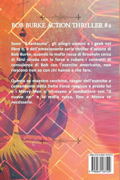 Proiettili, bombe e caos! Bob Burke è tornato per il numero 4! Questa volta si scontra con la mafia russa e con lo "Zar" in persona al Cremlino! 4,6 stelle su 625 recensioni US Amazon! Grande lettura!Quando la mafia russa di Brighton Beach ruba il contratto per il software dell'esercito della sua azienda, fa esplodere l'edificio dei suoi uffici a Chicago e attacca la foresta di Sherwood, è troppo!Dopo gli scontri con i terroristi dell'ISIS, le famiglie mafiose Genovese e Lucchese di New York in un casinò di Atlantic City e una sparatoria con la mafia DiGrigoria di Chicago in un bosco della Forest Preserve, tutto ciò che questo ex cecchino dell'esercito, Ranger e comandante della Delta Force desiderava era tornare alla sua fattoria in North Carolina, rilassarsi e godersi la vita. Ma questo può aspettare. È tempo di smantellare la loro operazione a Brooklyn, di prendere i loro "soldi per il pranzo", di spaccare qualche culo e di fare una visita a domicilio al loro capo nella sua Dacha a Mosca.Con l'aiuto dei Merry Men, di un colonnello dell'esercito russo, di Sasha il russo pazzo, di fucili da cecchino, naturalmente, e di un sacco di esplosivo al plastico, il gioco è iniziato! Come Burke's War, Burke's Gamble, Burke's Revenge, Burke's Samovar, il nuovo Burke's Mandarin e l'imminente Burke's Rescue, l'azione è senza sosta! È arrivato il momento di vendicarsi e di assaporare il gusto della vendetta. Sottodimensionato, sottovalutato e ora dirigente di una compagnia di telecomunicazioni, viene spesso liquidato semplicemente come il "ragazzo dei telefoni", ma come attesteranno i suoi ex sergenti Delta, sia che porti con sé un fucile di precisione Barrett calibro .50, un coltello tattico o semplicemente a mani nude, è una delle macchine per uccidere più letali che il governo degli Stati Uniti abbia mai prodotto. Se siete alla ricerca di un buon libro da spiaggia o di qualcosa con cui accoccolarvi davanti al fuoco, questo thriller cospirativo dal ritmo incalzante è stato scritto dall'autore di Burke's War, Burke's Gamble, Burke's Revenge, Burke's Samovar, Burke's Mandarin, Burke's Rescue e il nuovo Burke's Machete. Potrebbero piacervi anche The Undertaker, Amongst My Enemies, Thursday at Noon, Winner Lose All e Aim True, My Brother. Insieme, questi libri hanno oltre 2.00 recensioni a 5 stelle su US Kindle. Buon divertimento!