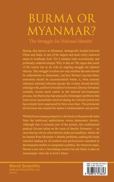 Burma, also known as Myanmar, strategically located between China and India, is one of the largest and most richly endowed states in Southeast Asia. Yet it remains both economically and politically underdeveloped. Why is this so? We argue that much of the reason has to do with an ongoing struggle for national identity. This struggle involves not only whether the state should be authoritarian or democratic, but how Burma's myriad ethnic minorities should be accommodated within it, what external reference national reference groups the country should identify and align with, and how it should move forward. Identity formation normally occurs much earlier in the national developmental process, but Burma has had unusually intransigent problems that were never successfully resolved during the colonial period and have simply been suppressed by force since then. This protracted divisiveness has stunted the nation's modernization and growth. Written from a unique perspective, this book on Myanmar deviates from the traditional authoritarian versus democratic rhetoric. Although that is certainly part of the picture, this multifaceted analysis focuses rather on the issue of identity formation an issue that has all too often failed to make the headlines. Much can be learned from Myanmar's identity problems, making this book essential reading for all students and professionals interested in development studies or comparative politics. By whatever name, Burma is not only a fascinating country but one likely to play an increasingly vital role in Asia's future.