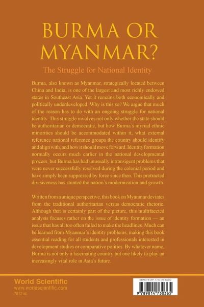 Burma, also known as Myanmar, strategically located between China and India, is one of the largest and most richly endowed states in Southeast Asia. Yet it remains both economically and politically underdeveloped. Why is this so? We argue that much of the reason has to do with an ongoing struggle for national identity. This struggle involves not only whether the state should be authoritarian or democratic, but how Burma's myriad ethnic minorities should be accommodated within it, what external reference national reference groups the country should identify and align with, and how it should move forward. Identity formation normally occurs much earlier in the national developmental process, but Burma has had unusually intransigent problems that were never successfully resolved during the colonial period and have simply been suppressed by force since then. This protracted divisiveness has stunted the nation's modernization and growth. Written from a unique perspective, this book on Myanmar deviates from the traditional authoritarian versus democratic rhetoric. Although that is certainly part of the picture, this multifaceted analysis focuses rather on the issue of identity formation an issue that has all too often failed to make the headlines. Much can be learned from Myanmar's identity problems, making this book essential reading for all students and professionals interested in development studies or comparative politics. By whatever name, Burma is not only a fascinating country but one likely to play an increasingly vital role in Asia's future.