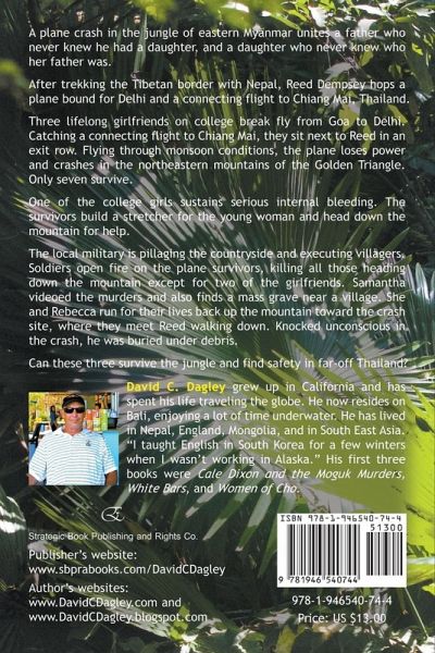 A plane crash in the jungle of eastern Myanmar unites a father who never knew he had a daughter, and a daughter who never knew who her father was. After trekking the Tibetan border with Nepal, Reed Dempsey hops a plane bound for Delhi and a connecting flight to Chiang Mai, Thailand. Three lifelong girlfriends on college break fly from Goa to Delhi. Catching a connecting flight to Chiang Mai, they sit next to Reed in an exit row. Flying through monsoon conditions, the plane loses power and crashes in the northeastern mountains of the Golden Triangle. Only seven survive. One of the college girls sustains serious internal bleeding. The survivors build a stretcher for the young woman and head down the mountain for help. The local military is pillaging the countryside and executing villagers. Soldiers open fire on the plane survivors, killing all those heading down the mountain except for two of the girlfriends. Samantha videoed the murders and also finds a mass grave near a village. She and Rebecca run for their lives back up the mountain toward the crash site, where they meet Reed walking down. Knocked unconscious in the crash, he was buried under debris. Can these three survive the jungle and find safety in far-off Thailand? Author Bio: David C. Dagley grew up in California and has spent his life traveling the globe. He now resides on Bali, enjoying a lot of time underwater. He has lived in Nepal, England, Mongolia, and in South East Asia. "I taught English in South Korea for a few winters when I wasn't working in Alaska." His first three books were Cale Dixon and the Moguk Murders, White Bars, and Women of Cho.