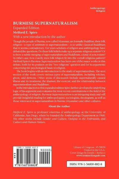 In the introduction to this expanded edition Spiro further develops the underlying logic of his argument and evaluates the most recent contributions to the field of the anthropology of religion. Burmese Supernaturalism is an intriguing study and will provide insightful reading for anthropologists, sociologists, theologians, as well as those interested in supernaturalism in Burma (Myanmar) and other cultures.