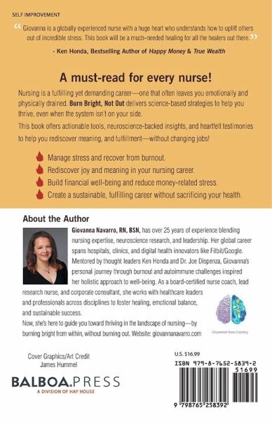 Burnout Solutions for Nurses in A Broken System. Because thriving isn't a luxury-it's your next step. You didn't become a nurse to feel exhausted, unappreciated, and constantly giving more than you're paid for-just to survive. But the long shifts, relentless demands, and emotional toll have left you drained-questioning whether you can keep going. Burnout isn't just exhaustion; it's a slow erosion of everything that once made you feel alive. In Burn Bright, Not Out, neuroscience, behavioral health, and real-life experience come together to prove one thing: you can heal, even if your workplace never changes. This isn't about toxic positivity or just "taking better care of yourself." It's about rewiring your mind, restoring your energy, and reclaiming the passion that made you a nurse in the first place. Through science-backed strategies, raw personal stories, and practical steps, you'll learn how to break free from burnout and step into a life of clarity, purpose, and balance. The system is broken, but you don't have to be. You are not alone, and you are not powerless. It's time to stop running on empty. Your new way forward starts here. This book is your strategic guide to do so. The world doesn't just need more nurses, it needs nurses who burn bright from within.