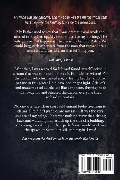 I'll Burn Down The World For Her. My Father used to say that I was dramatic and weak and needed to toughen up. My mother used to say nothing. The only glimmer of happiness I had was my brother Asher. We could keep each other safe from the man that turned into a monster and the woman that let it happen. Until I fought back. After that, I was scarred for life and found myself locked in a room that was supposed to be safe. But safe for whom? For the doctors who tormented me, or for my brother who had put me in this place? I did have one bright light. Adalyn's made me feel a little less like a monster. But they took her away too and released the inner demons in my mind that everyone tried so hard to contain. No one was safe when a rabid animal broke free from its chains. Fire didn't just cleanse my sins-It was the very essence of my being. There was nothing purer than sitting back and watching flames lick up the side of a building, consuming everything in their path. Some would say I was the spawn of Satan himself, and maybe I was? But not even the devil could burn the world like I could.
