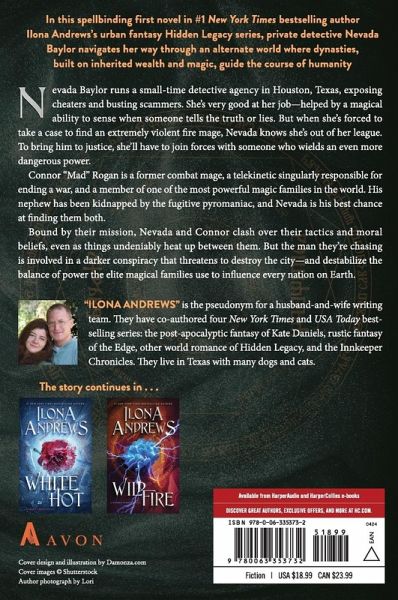 In this spellbinding first novel in #1 New York Times bestselling author Ilona Andrews’s urban fantasy Hidden Legacy series, private detective Nevada Baylor navigates her way through an alternate world where dynasties, built on inherited wealth and magic, guide the course of humanity. Nevada Baylor runs a small-time detective agency in Houston, Texas, busting scammers, exposing cheaters, and dealing with petty criminals. She’s very good at her job—helped by a magical ability to sense when someone tells the truth or lies. But when she’s forced into accepting a case to find a radical pyrotechnic who can conjure heat and fire at will, Nevada knows she’s out of her league. To bring him to justice, she’ll have to join forces with someone who wields an even more dangerous power. Connor “Mad” Rogan is a former combat mage, a telekinetic singularly responsible for mass destruction in war-torn countries, and a member of one of the most powerful magic families in the world. His nephew has been kidnapped by the fugitive pyromaniac, and Nevada is his best chance at finding them both. But unlike Nevada, Connor could care less about societal law and order, and has no qualms about extinguishing his family’s enemy. Bound by their mission, Nevada and Connor clash over their tactics and moral beliefs, even as things undeniably heat up between them. But the man they’re chasing is involved in a darker conspiracy that threatens to destroy the city—and destabilize the balance of power the elite magical families use to influence every nation on Earth.