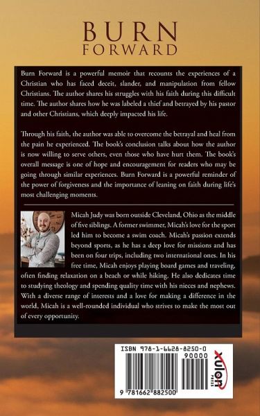 Burn Forward is a powerful memoir that recounts the experiences of a Christian who has faced deceit, slander, and manipulation from fellow Christians. The author shares his struggles with his faith during this difficult time. The author shares how he was labeled a thief and betrayed by his pastor and other Christians, which deeply impacted his life. Through his faith, the author was able to overcome the betrayal and heal from the pain he experienced. The book's conclusion talks about how the author is now willing to serve others, even those who have hurt them. The book's overall message is one of hope and encouragement for readers who may be going through similar experiences. Burn Forward is a powerful reminder of the power of forgiveness and the importance of leaning on faith during life's most challenging moments. Micah Judy was born outside Cleveland, Ohio as the middle of five siblings. A former swimmer, Micah's love for the sport led him to become a swim coach. Micah's passion extends beyond sports, as he has a deep love for missions and has been on four trips, including two international ones. In his free time, Micah enjoys playing board games and traveling, often finding relaxation on a beach or while hiking. He also dedicates time to studying theology and spending quality time with his nieces and nephews. With a diverse range of interests and a love for making a difference in the world, Micah is a well-rounded individual who strives to make the most out of every opportunity.