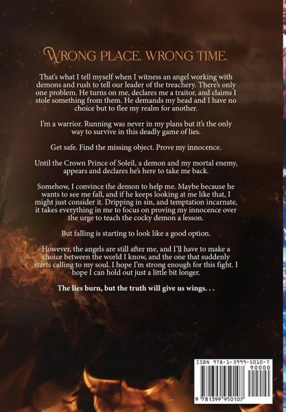 Wrong place, wrong time. That's what I tell myself when I witness an angel working with demons and rush to tell our leader of the treachery. There's only one problem. He turns on me, declares me a traitor, and claims I stole something from them. He demands my head and I have no choice but to flee my realm for another. I'm a warrior. Running was never in my plans but it's the only way to survive in this deadly game of lies. Get safe. Find the missing object. Prove my innocence. Until the Crown Prince of Soleil, a demon and my mortal enemy, appears and declares he's here to take me back. Somehow, I convince the demon to help me. Maybe because he wants to see me fall, and if he keeps looking at me like that, I might just consider it. Dripping in sin, and temptation incarnate, it takes everything in me to focus on proving my innocence over the urge to teach the cocky demon a lesson. But falling is starting to look like a good option. However, the angels are still after me, and I'll have to make a choice between the world I know, and the one that suddenly starts calling to my soul. I hope I'm strong enough for this fight. I hope I can hold out just a little bit longer. The lies burn, but the truth will give us wings. . . **BURN ME is a spicy standalone paranormal romance set in the Immortal Vices and Virtues Universe. Every book is a guaranteed happily ever after with a satisfying ending and no cliffhangers. Perfect for fans of Immortals After Dark, Black Dagger Brotherhood, and the Demonica series. **