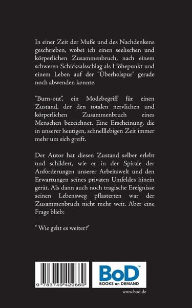 In einer Zeit der Muße und des Nachdenkens geschrieben, wobei ich einen seelischen und körperlichen Zusammenbruch, nach einem schweren Schicksalsschlag als Höhepunkt und einem Leben auf der "Überholspur" gerade noch abwenden konnte."Burn-out", eine Modebegriff für einen Zustand, der den totalen nervlichen und körperlichen Zusammenbruch eines Menschen bezeichnet. Eine Erscheinung, die in unserer heutigen, schnelllebigen Zeit immer mehr um sich greift.Der Autor hat diesen Zustand selber erlebt und schildert, wie er in der Spirale der Anforderungen unserer Arbeitswelt und den Erwartungen seines privaten Umfeldes hinein gerät. Als dann auch noch tragische Ereignisse seinen Lebensweg pflastern war der Zusammenbruch nicht mehr weit. Aber eine Frage blieb: "Wie geht es weiter?"