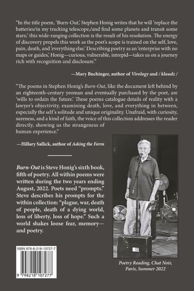 Burn-Out is an eclectic, intelligent poetry collection that explores the elements of modern life, relationships between men and women often gone awry, the pains of living in our curious and frightening times, the overlay of death, and concludes with an ode to Kierkegaard and the deconstruction of a will made by an illiterate yeoman in 1745 that serves as a counterpoint to the complexity and lack of clarity in today's world. Burn-Out is Steve Honig's sixth book, fifth of poetry. All poems were written during the two years ending August, 2022. Poets need "prompts." Steve describes his prompts for the collection: "plague, war, death of people, death of a dying world, loss of liberty, loss of hope." Such a world shakes loose fear, memory-and poetry.