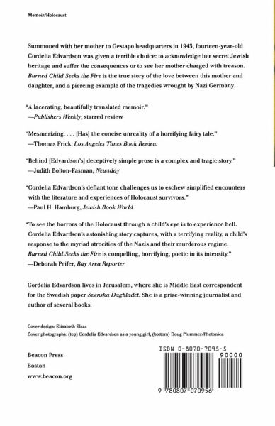 [A] searing memoir. . . . An enduring, indeed universal, story. Robert Taylor, The Boston Globe Summoned with her mother to Gestapo headquarters in 1943, fourteen-year-old Cordelia Edvardson was given a terrible choice: to acknowledge her secret Jewish heritage and suffer the consequences or to see her mother charged with treason. Burned Child Seeks the Fire is the true story of the love between this mother and daughter, and a piercing example of the tragedies wrought by Nazi Germany. "A lacerating, beautifully translated memoir." Publishers Weekly, starred review "Mesmerizing. . . . [Has] the concise unreality of a horrifying fairy tale." Thomas Frick, Los Angeles Times Book Review "Behind [Edvardson's] deceptively simple prose is a complex and tragic story." Judith Bolton-Fasman, Newsday "Cordelia Edvardson's defiant tone challenges us to eschew simplified encounters with the literature and experiences of Holocaust survivors." Paul H. Hamburg, Jewish Book World "To see the horrors of the Holocaust through a child's eye is to experience hell. Cordelia Edvardson's astonishing story captures, with a terrifying reality, a child's response to the myriad atrocities of the Nazis and their murderous regime. Burned Child Seeks the Fire is compelling, horrifying, poetic in its intensity." Deborah Peifer, Bay Area Reporter
