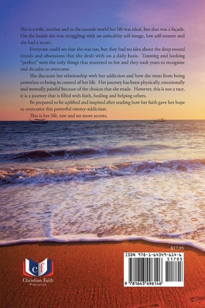 She is a wife, mother and to the outside world her life was ideal, but that was a façade. On the inside she was struggling with an unhealthy self-image, low self-esteem and she had a secret. Everyone could see that she was tan, but they had no idea about the deep rooted rituals and obsessions that she dealt with on a daily basis. Tanning and looking "perfect" were the only things that mattered to her and they took years to recognize and decades to overcome. She discusses her relationship with her addiction and how she went from being powerless to being in control of her life. Her journey has been physically, emotionally and mentally painful because of the choices that she made. However, this is not a race, it is a journey that is filled with faith, healing and helping others. Be prepared to be uplifted and inspired after reading how her faith gave her hope to overcome this powerful enemy-addiction. This is her life, raw and no more secrets.