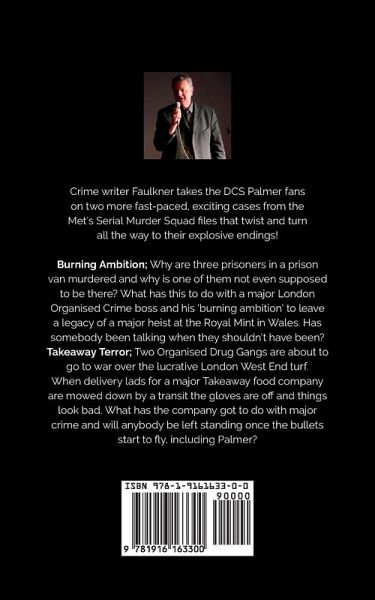 In Burning Ambition a burnt-out prison van with three pre-murdered bodies inside doesn't make sense. Especially as one of the bodies wasn't a prisoner and should not even be there. Why would these three be killed and what has it to do with the final signature heist being put together by an Organised Crime boss to rob the Royal Mint in Wales? In Takeaway Terror delivery boys on scooters working for a reputable meal delivery service are being targetted and mown down by a large van. Palmer thinks this has something to do with two organised crime gangs who are about to go to war for the lucrative London West End drugs trade. When an old adversary with skills in bomb-making joins one gang Palmer must act and act fast. Will anybody be left standing once the bullets fly, including Palmer?