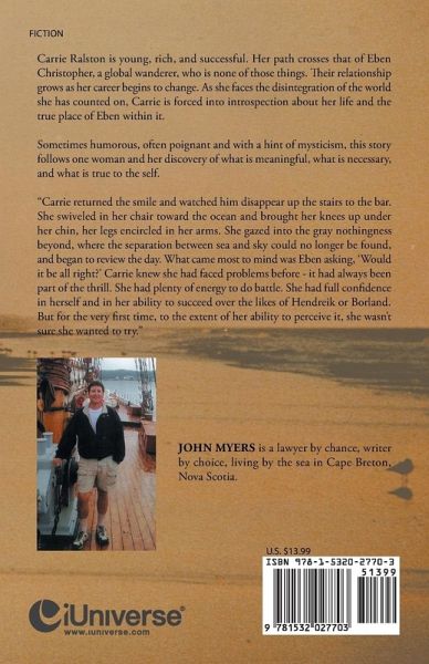 Carrie Ralston is young, rich, and successful. Her path crosses that of Eben Christopher, a global wanderer, who is none of those things. Their relationship grows as her career begins to change. As she faces the disintegration of the world she has counted on, Carrie is forced into introspection about her life and the true place of Eben within it. Sometimes humorous, often poignant and with a hint of mysticism, this story follows one woman and her discovery of what is meaningful, what is necessary, and what is true to the self. Carrie returned the smile and watched him disappear up the stairs to the bar. She swiveled in her chair toward the ocean and brought her knees up under her chin, her legs encircled in her arms. She gazed into the gray nothingness beyond, where the separation between sea and sky could no longer be found, and began to review the day. What came most to mind was Eben asking, Would it be all right? Carrie knew she had faced problems before - it had always been part of the thrill. She had plenty of energy to do battle. She had full confidence in herself and in her ability to succeed over the likes of Hendreik or Borland. But for the very first time, to the extent of her ability to perceive it, she wasnt sure she wanted to try.
